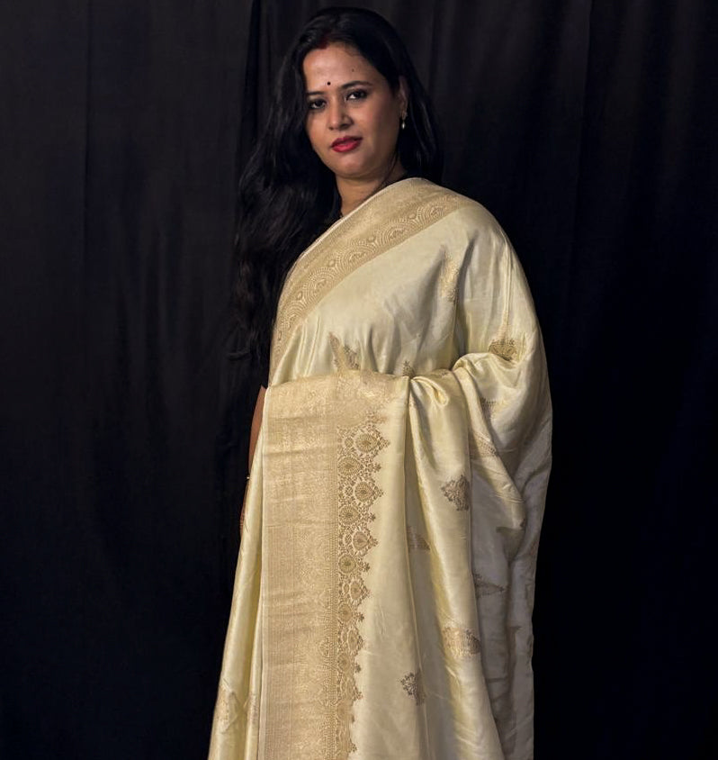 Banarasi Handloom Pure Khaddi Tussar Georgette Saree with Elegant Resham Floral Buti & Silver Zari Weaving