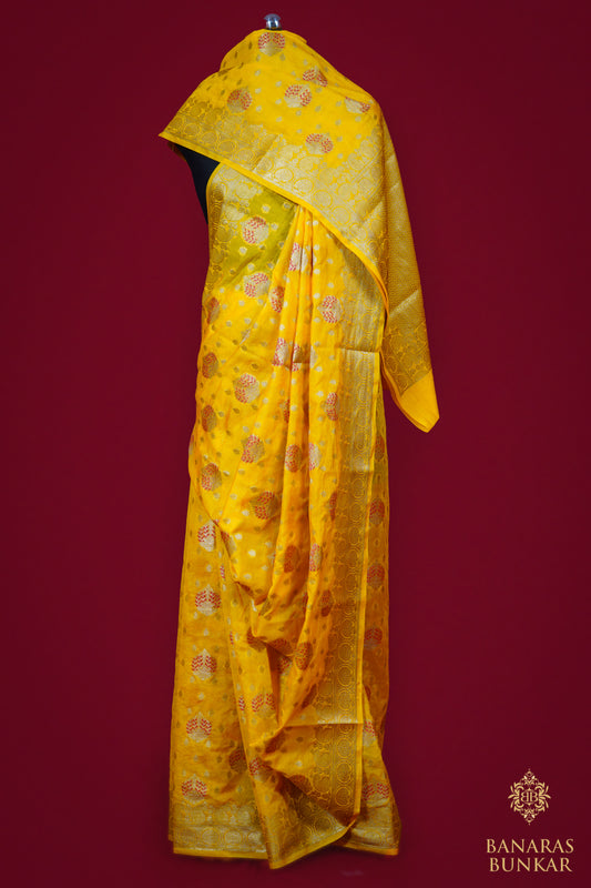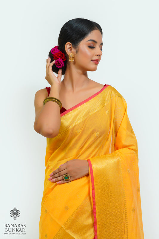 Banarasi Handloom Katan Silk Saree with Allover Chunar Jali & Almond Gold Zari Weaving