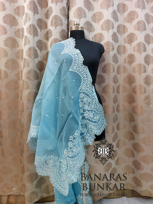 Banarasi Pure Chikenkari organza silk Dupatta - Firozi