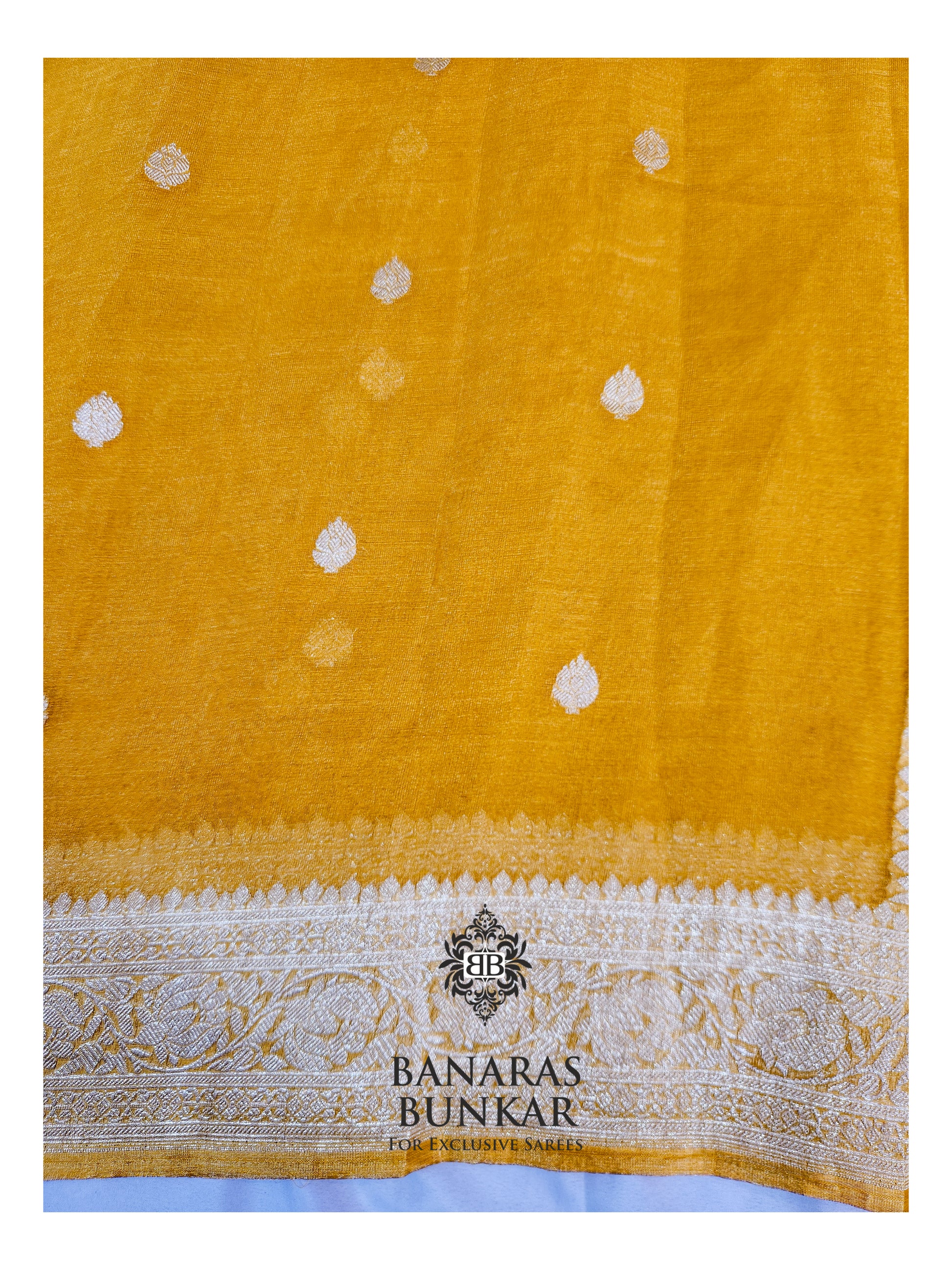 Experience timeless Banarasi elegance with this pure handloom Kaduwa tissue georgette saree, meticulously handwoven by skilled artisans of Banaras. The saree features a delicate allover silver zari buti design, beautifully balanced with an equal silver zari border on both sides, adding symmetry and grace to the drape.