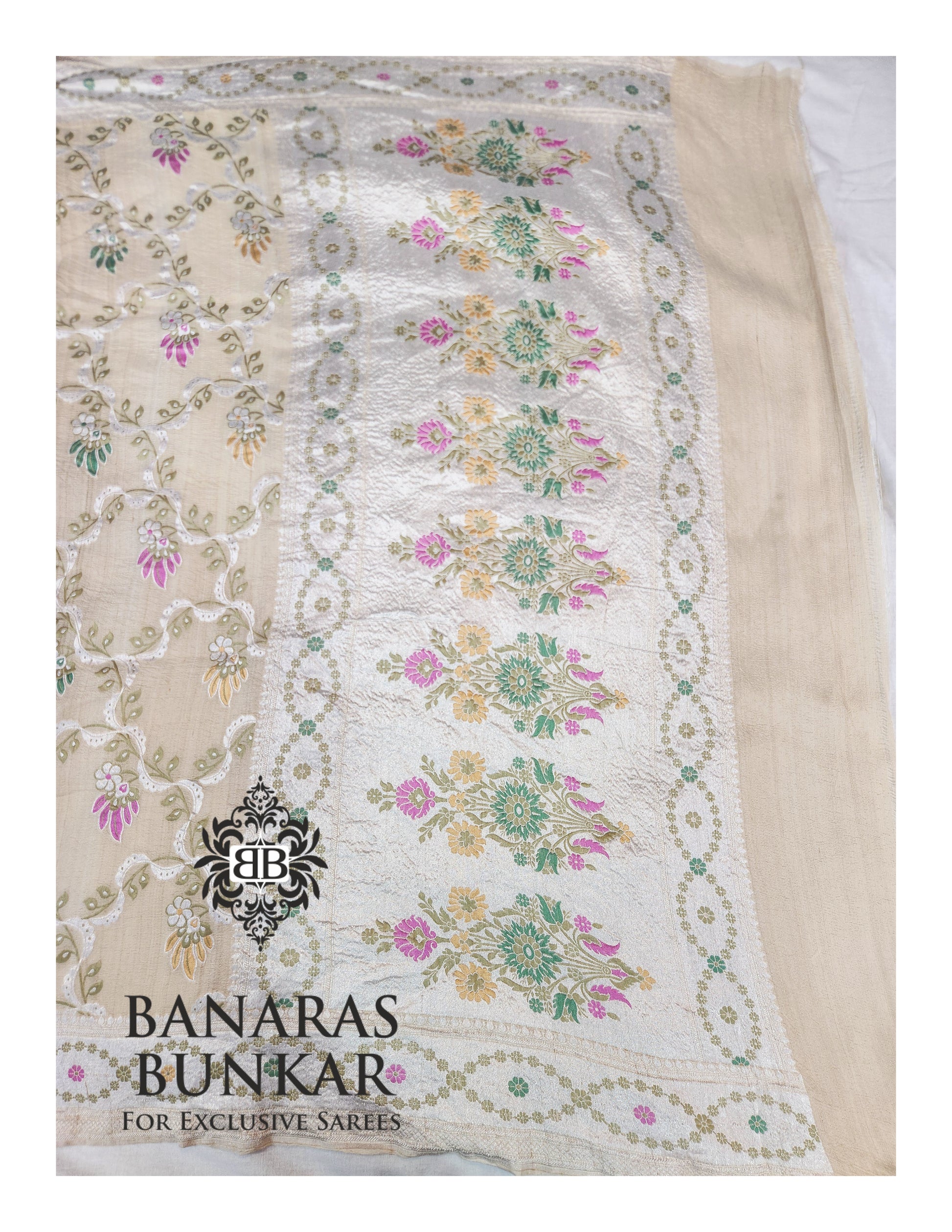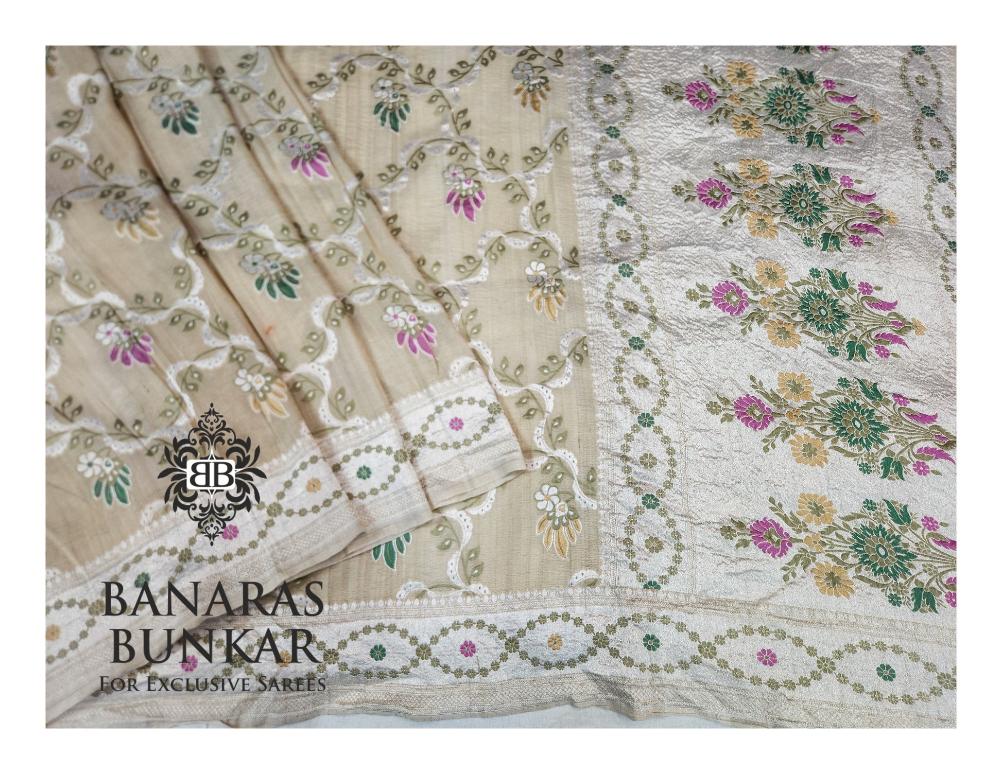 Banarasi Handloom Pure Khaddi Tussar Georgette Saree with Elegant Resham Floral Buta jaal & Silver Zari Weaving