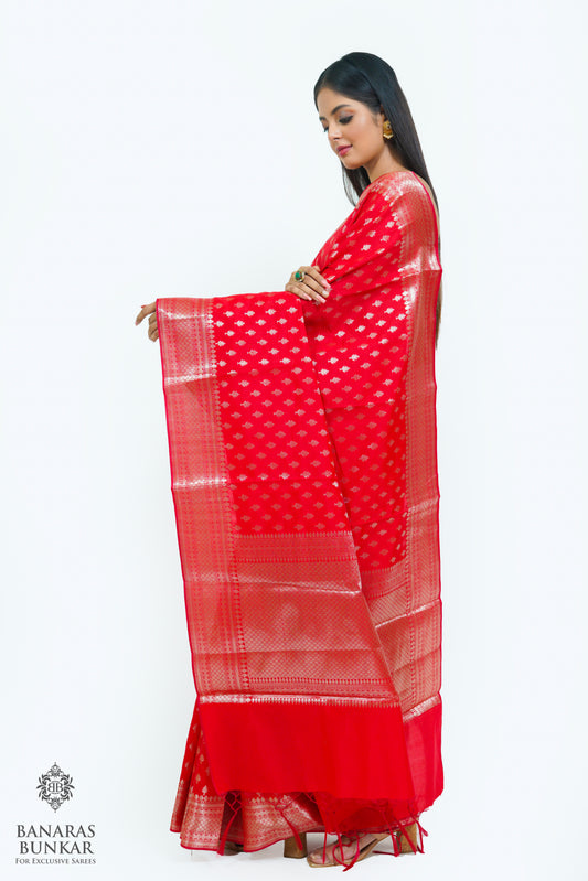 Banarasi Handloom Pure Khaddi Tussar Georgette Saree with Elegant Resham Floral Buta & Silver Zari Weaving