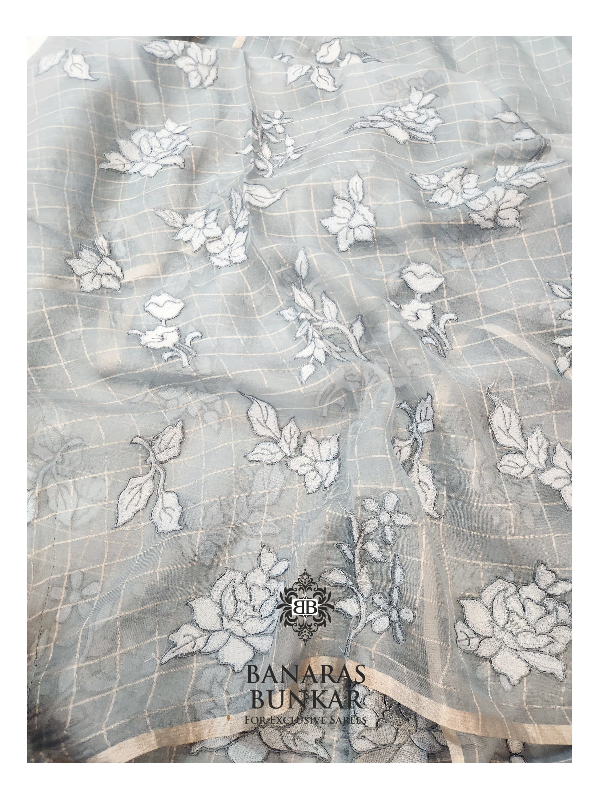 Banarasi Pure Chikankari Organza Silk Saree with Allover Floral Buta Resham Embroidery