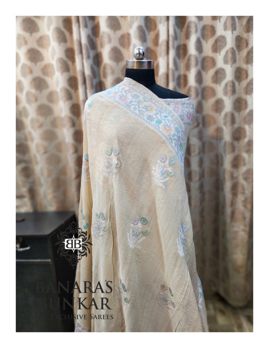 Banarasi Handloom Pure Khaddi Tussar Georgette Saree with Elegant Resham Floral Buti & Silver Zari Weaving